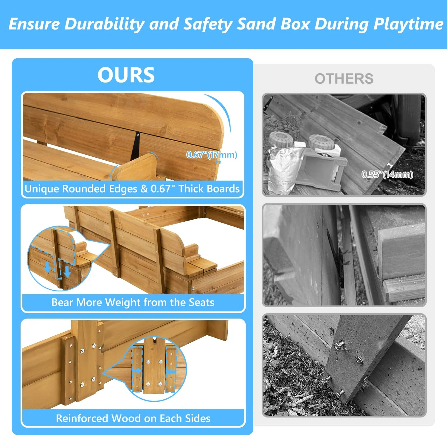 • Foldable Seats and Convenient Cover: Our sandbox features a lightweight, easy-to-open cover that kids can manage on their own. It includes two foldable benches that accommodate up to 4children, with each bench supporting a maximum weight of 200 lbs. The smooth, rounded edges ensure a safe play environment by minimizing the risk of injuries.