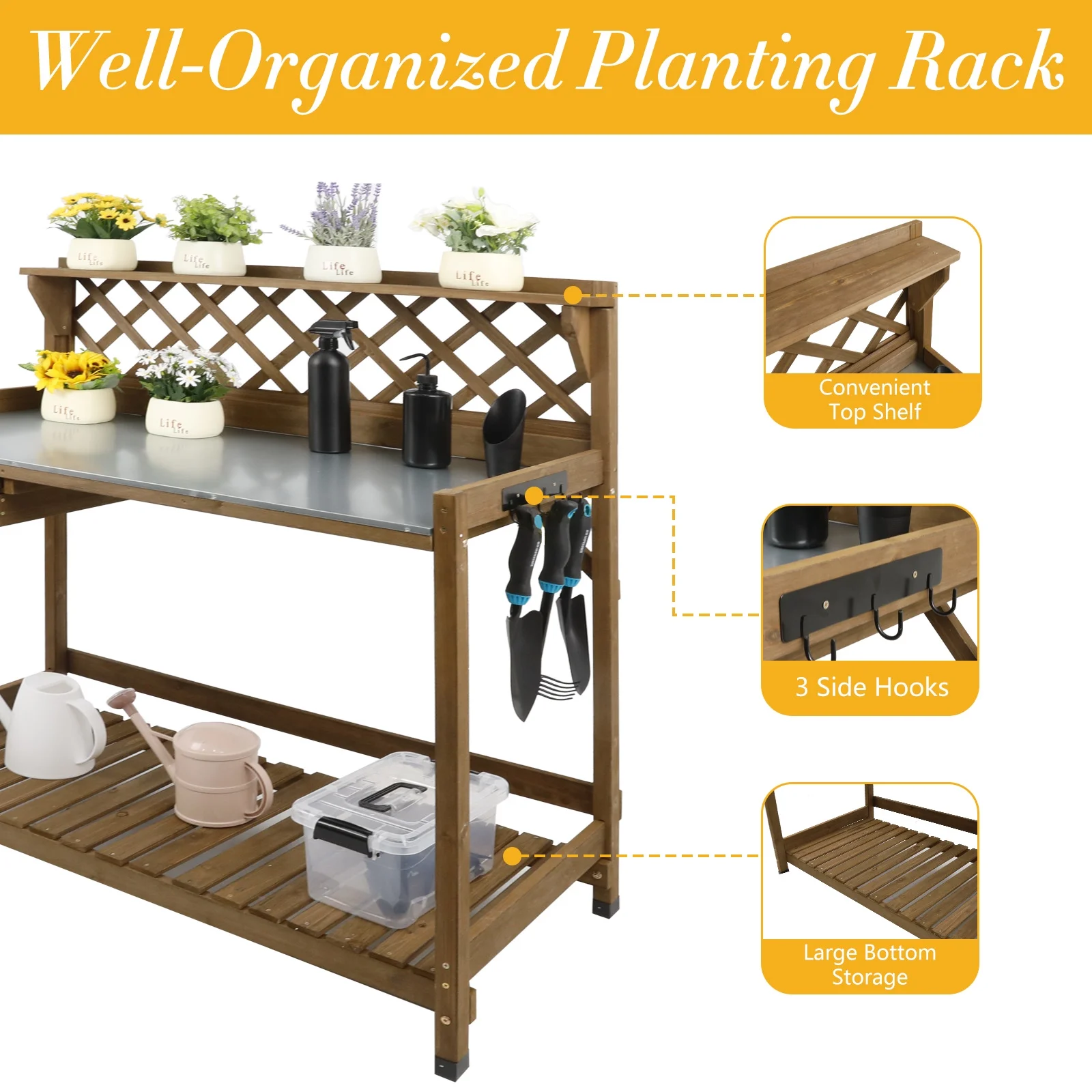 - 【THOUGHTFUL DESIGN】Enhance Your Gardening With This Versatile Potting Table Featuring A Top Shelf For Plants And Tools. Raised Edges Prevent Items From Falling, While Three Side Hooks Keep Tools Within Easy Reach. The Waterproof Rubber Feet Protect Surfaces And Prevent Damage From Ground Moisture.