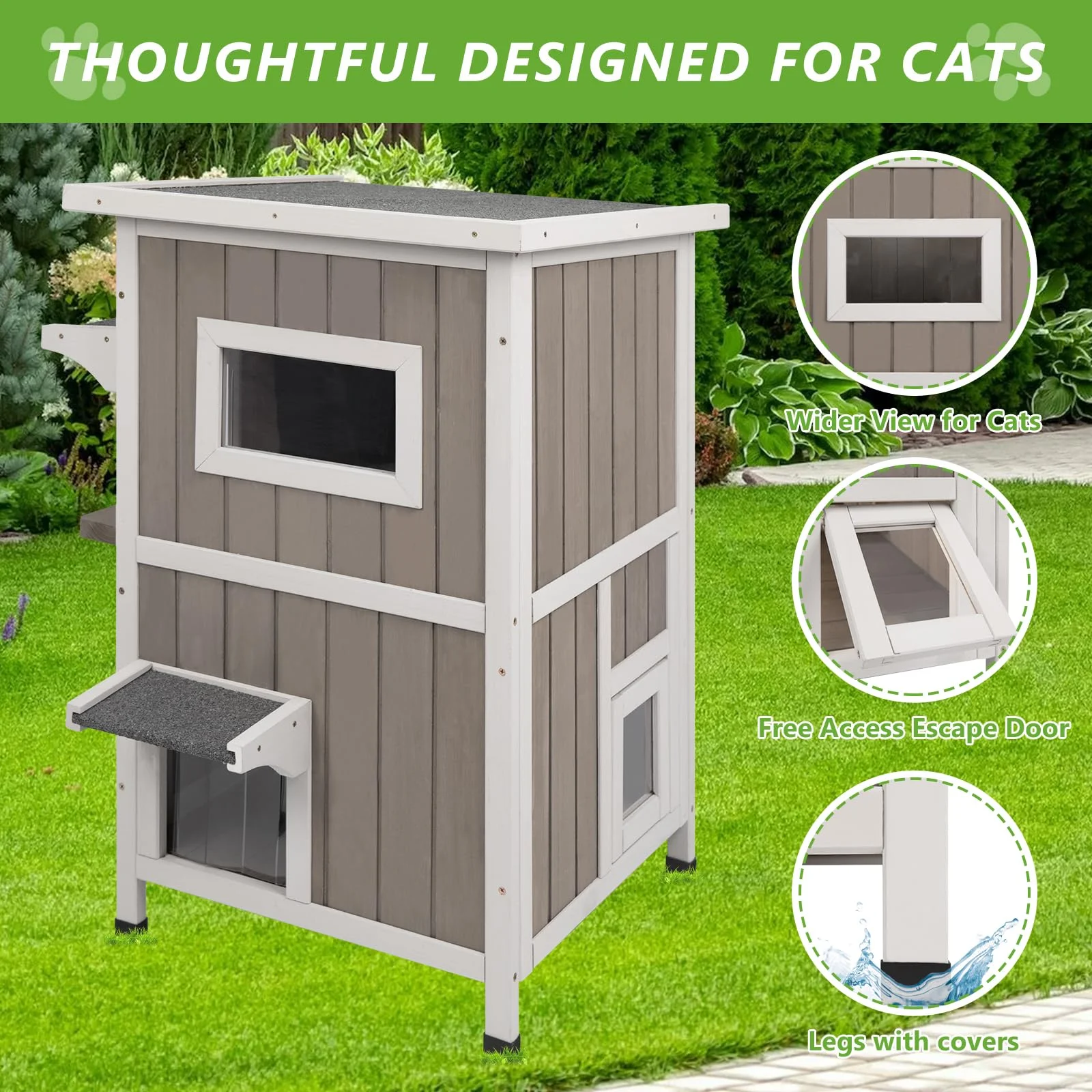 • 【THOUGHTFUL DESIGN FOR CATS】A cat house outdoor ideal will create a functional and inviting environment for your feline friends! A wider transparent window on the 2nd floor, besides, the essential escape doors adds to the 2-story cat shelter house, which is waterproof with high legs and sturdy instruction even in the grass. Elevated legs keep the house off the ground, offering a sense of security and helping to prevent dampness.