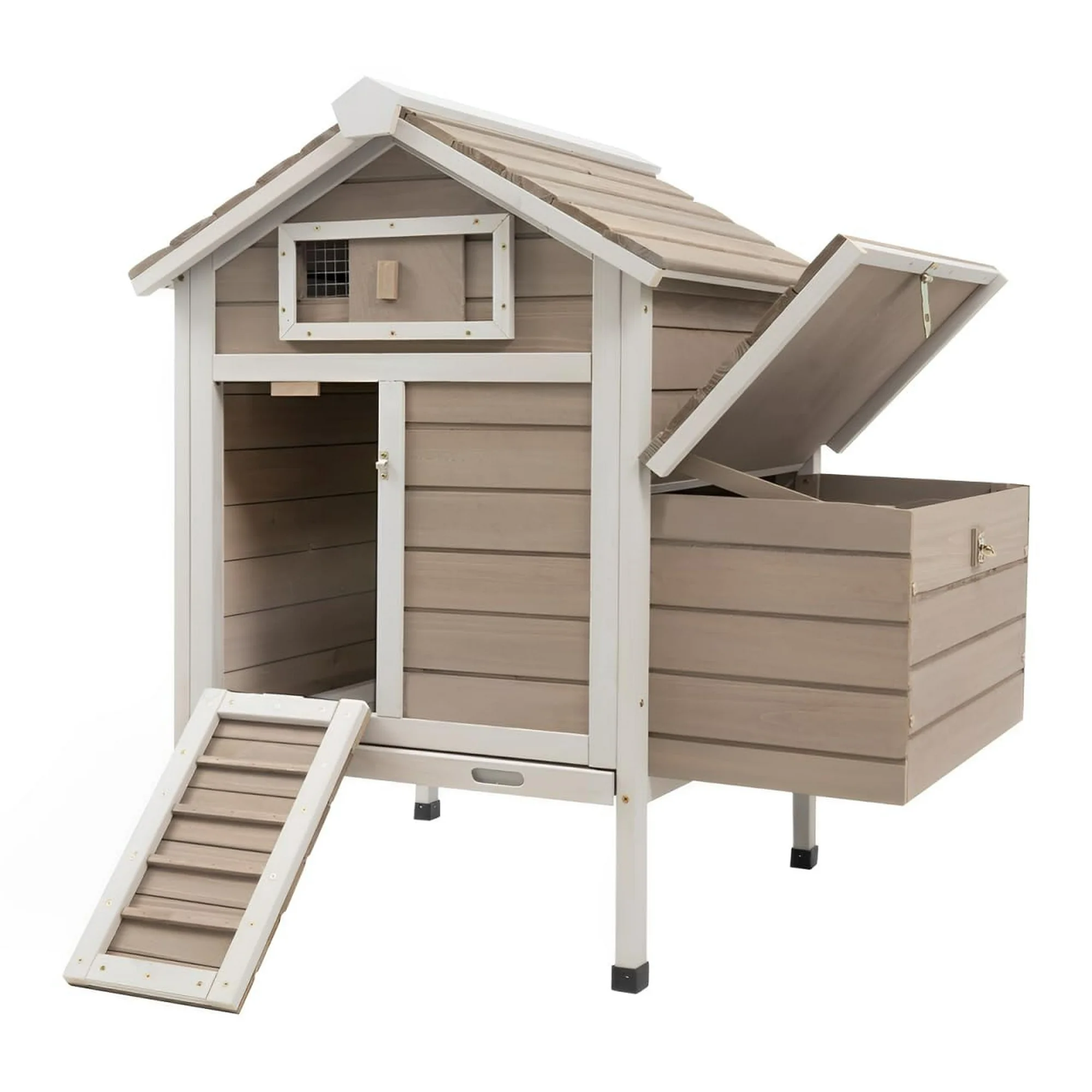 Elevate your poultry care with this premium chicken coop, crafted from natural fir wood for a stable and cozy home. The coop features a waterproof, full-coverage slanted roof, ensuring a dry haven even on rainy days. Its practical nest box includes a switchable roof and metal lock for enhanced protection. The pen doubles as a ramp, with wooden ridges and a pull-out tray for effortless cleaning. A metal lock secures your pets, while a sliding wood window with wire mesh offers a clear view. Perching bars in the resting area provide extra comfort. Elevated on 7.5-inch legs with waterproof rubber feet, the coop ensures excellent air circulation and protection. Easy to assemble with clearly marked parts and provided instructions, it’s perfect for 1-3 chickens. For any queries, feel free to contact us for a satisfactory response.