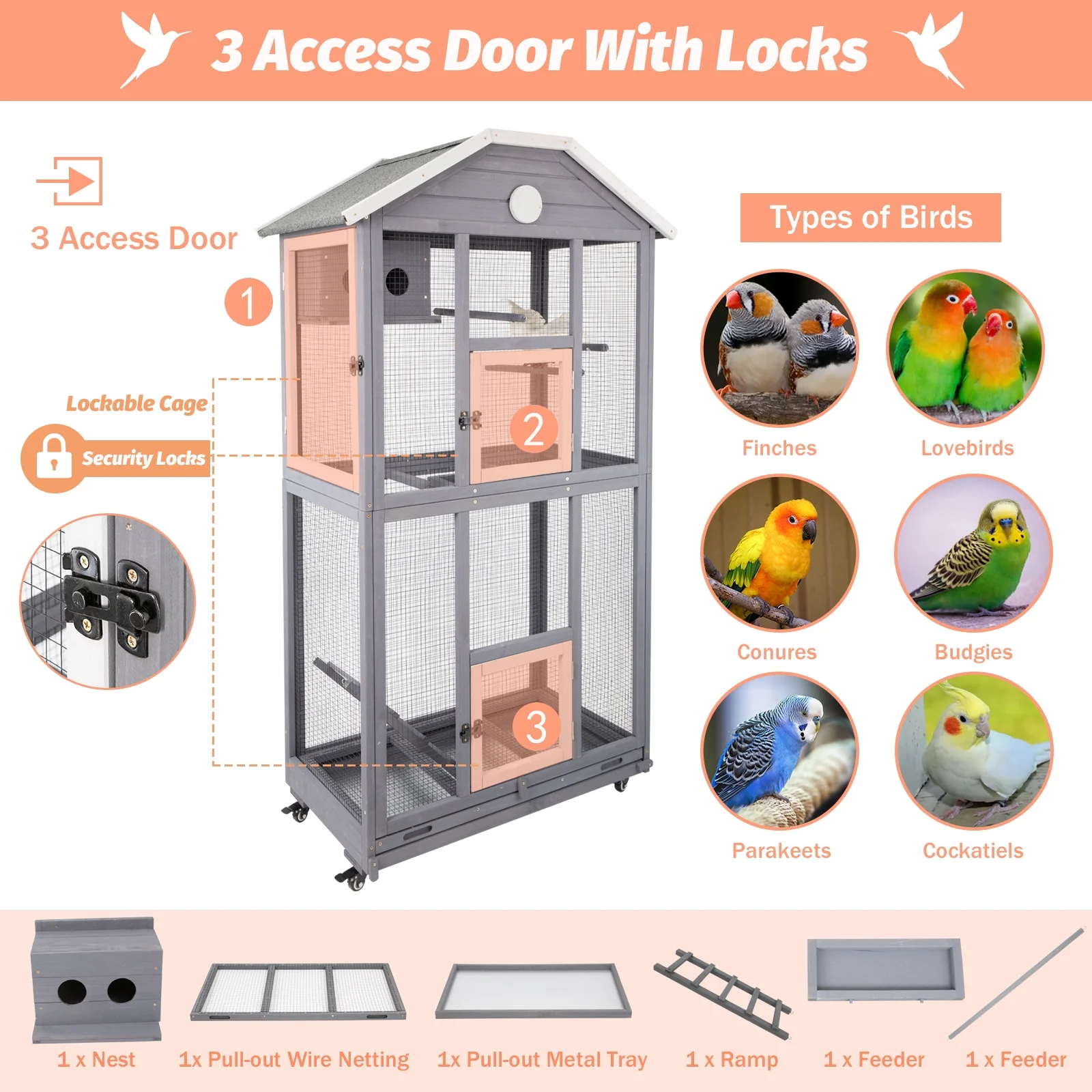 - 【Wheeled Bird Cage】Equipped with four braked casters, you can effortlessly move the parrot cage from indoors to outdoors, ensuring your birds enjoy a change of scenery while staying safe.