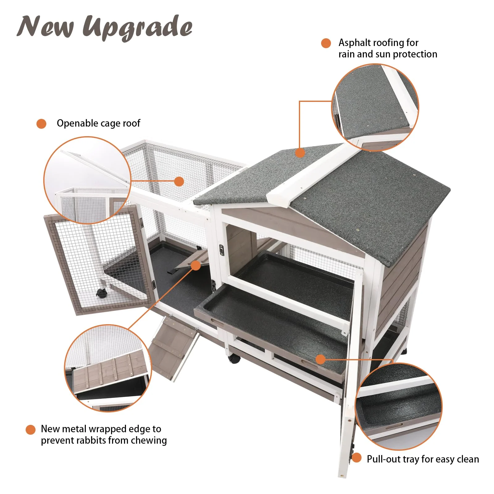 - Humanity Design: The 3 removable trays of the rabbit cage indoor make the guinea pig condo easier to clean which will not leak. The bunny hutch have 6 wheels which are convenient to move. You can easily to retrieve your pets from the cage as the top of the activity area is openable,which is also simple for you to feed them.